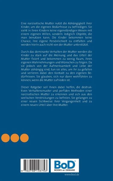 Eine narzisstische Mutter nutzt die Abhängigkeit ihrer Kinder, um die eigenen Bedürfnisse zu befriedigen. Sie sieht in ihren Kindern keine eigenständigen Wesen mit einem eigenen Willen, sondern lediglich Objekte, die man benutzen kann. Die Kinder bekommen keine Chance, ihre eigene Persönlichkeit zu entfalten und werden hierin auch nicht von der Mutter unterstützt.Durch das dominante Verhalten der Mutter werden die Kinder zu stark auf die Meinung und das Urteil der Mutter fixiert und bekommen zu wenig Raum, ihren eigenen Wahrnehmungen und Wünschen zu folgen. Da sie jedoch von der Aufmerksamkeit und Liebe der Mutter abhängig sind, tun sie alles, um ihr zu gefallen und verlieren dabei den Kontakt zu den eigenen Bedürfnissen. Sie glauben, sich nur dann wohlfühlen zu können, wenn die Mutter zufrieden ist.Dieser Ratgeber soll Ihnen dabei helfen, die destruktiven Verhaltensmuster und perfiden Methoden einer narzisstischen Mutter zu erkennen und sich aus den seelischen Verstrickungen zubefreien. Sie gelangen zu einer neuen Sichtweise Ihrer Vergangenheit und zu einem neuen Urteil über Ihre Mutter. Dieses Buch beinhaltet zudem eine Meditation als MP3-Datei.