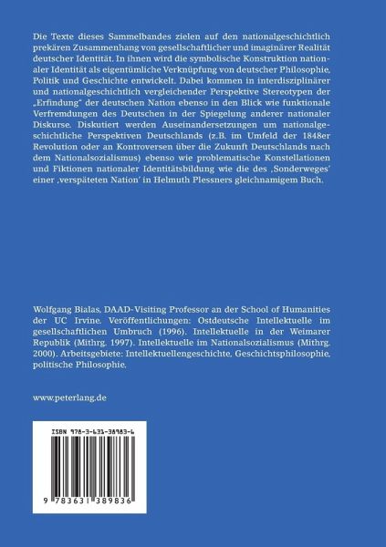 Aus dem Inhalt: Wolfgang Bialas: Einleitung - Wolfgang Bergem: Nationale Identität - Fatum oder Fiktion? - Dieter Thomä: Wie Europa versucht, Amerika auf den Begriff zu bringen. Über Condorcet, Tocqueville, Weber, Heidegger und andere - Hubert Orlowski: Nationerfindung und (Polens) Fremdwahrnehmung. Zur Funktion historischer Semantik und historischer Stereotypenforschung - Elizabeth A. Drummond: «Einen kräftigen Damm gegen die polnische Hochflut zu errichten» - Kultur und Natur im deutschen Ostmarkendiskurs, 1886-1914 - Wolfgang Bialas: Die verspätete Nation der Deutschen. Helmuth Plessners Deutschlandbuch - Hans-Joachim Hahn: Die deutsche Nationalitätenfrage aus der Sicht der 1848er Revolution - Christian Jansen: Deutsches Volk und Deutsches Reich. Zur Pathologie der Nationalstaatsidee im 19. Jahrhundert - Ehrhard Bahr: Volksbegriff und der deutsche Nationalismus um 1808 - Jens Rieckmann: «Nicht 'reif' für dies Wiedersehen»: Thomas Mann und die Deutschen - Die Deutschen und Thomas Mann, 1945-1947 - John Smith: Thesen über den 'deutschen Willen' - Benno Wagner: Zur Geburt des Deutschseins aus dem semitischen Wüstensturm. 'Der Jude' als 'Razziant an arischem Geistesgut' - Anson Rabinbach: «Ein geöffneter Abgrund»: Auschwitz und die Moderne - Jeffrey Herf: Historische Erinnerung des Holocaust und die nationale Identität in Ost und West.