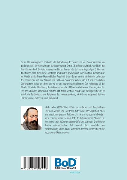 Dieses Offenbarungswerk beinhaltet die Betrachtung der Sonne und des Sonnensystems aus göttlicher Sicht. Der Herr führt uns durch die Wunder Seiner Schöpfung, so ähnlich, wie Eltern mit ihren Kindern durch die Natur spazieren und ihnen Blumen oder Schmetterlinge zeigen. Er lehrt uns das Staunen, denn durch dieses sieht man tiefer und so gesehen auch realer. Gott hat mit der Sonne ein Wunder erschaffen und keinen bloßen Feuerball. Unsere Sonne ist eine Mittlerin der Lichtkräfte des Universums und ein Wohnort von zahllosen Sonnenmenschen, die auf unterschiedlichen Sonnengürteln in Welten leben, wie wir sie uns kaum vorstellen können. Den Höhepunkt all der Wunder bildet die Offenbarung des äußersten, im Jahr 1842 noch unbekannten Planeten, dem der Herr den schönsten Namen aller Planeten gibt: Miron, Welt der Wunder. Am wichtigsten für uns ist jedoch die Beschreibung der Religionen der Sonnenbewohner, nämlich weitestgehend frei von Frömmelei und Sektiererei, uns zum Beispiel.