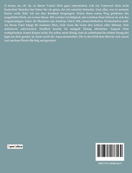 O kenne sie, eh' du zu ihrem Vorteil Dich ganz entscheidest. Laß ein Vaterwort Dich nicht bestechen! Manches hat Natur Für sie getan, das ich entzückt betrachte, Und alles, was in meinem Kreise webt, Hab' ich um ihre Kindheit hergelagert. Schon ihren ersten Weg geleiteten Ein ausgebildet Weib, ein weiser Mann. Mit welcher Leichtigkeit, mit welchem Sinn Erfreut sie sich des Gegenwärtigen, Indes ihr Phantasie das künft'ge Glück Mit schmeichelhaften Dichterfarben malt. An ihrem Vater hängt ihr frommes Herz, Und wenn ihr Geist den Lehren edler Männer, Sich stufenweis entwickelnd, friedlich horcht: So mangelt Übung ritterlicher Tugend Dem wohlgebauten, festen Körper nicht. Du selbst, mein König, hast sie unbekannt Im wilden Drang der Jagd um dich gesehn. Ja, heute noch! die Amazonentochter, Die in den Floß dem Hirsche sich zuerst Auf raschem Pferde flüchtig nachgestürzt.