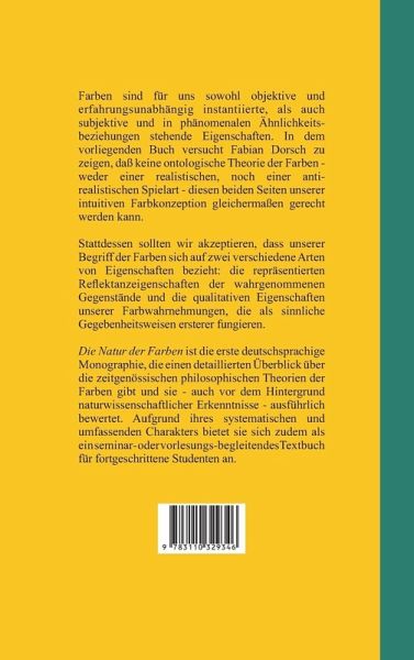 Farben sind für uns sowohl objektive, als auch phänomenale Eigenschaften. In seinem Buch argumentiert Fabian Dorsch, daß keine ontologische Theorie der Farben diesen beiden Seiten unseres Farbbegriffes gerecht werden kann. Stattdessen sollten wir akzeptieren, daß letzterer sich auf zwei verschiedene Arten von Eigenschaften bezieht: die repräsentierten Reflektanzeigenschaften von Gegenständen und die qualitativen Eigenschaften unserer Farbwahrnehmungen, die als sinnliche Gegebenheitsweisen ersterer fungieren. Die Natur der Farben gibt einen detaillierten Überblick über die zeitgenössischen philosophischen und naturwissenschaftlichen Theorien der Farben und bietet sich aufgrund seines systematischen und umfassenden Charakters auch als ein seminar- oder vorlesungsbegleitendes Textbuch an.