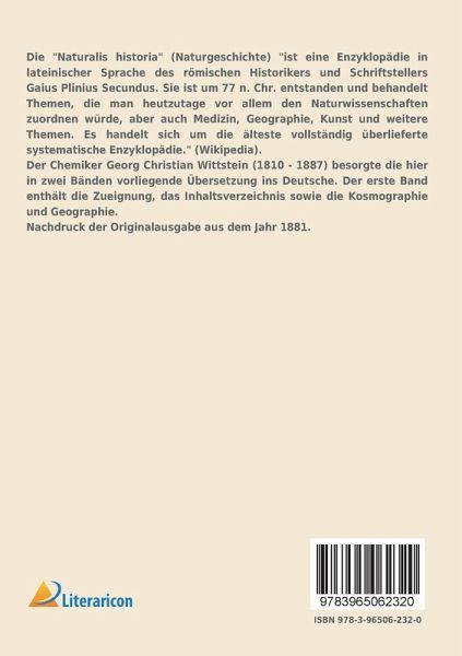 Die "Naturalis historia" (Naturgeschichte) "ist eine Enzyklopädie in lateinischer Sprache des römischen Historikers und Schriftstellers Gaius Plinius Secundus. Sie ist um 77 n. Chr. entstanden und behandelt Themen, die man heutzutage vor allem den Naturwissenschaften zuordnen würde, aber auch Medizin, Geographie, Kunst und weitere Themen. Es handelt sich um die älteste vollständig überlieferte systematische Enzyklopädie." (Wikipedia).