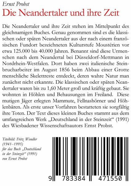 Die Neandertaler und ihre Zeit stehen im Mittelpunkt des gleichnamigen Buches. Genau genommen sind es die sogenannten klassischen oder späten Neandertaler aus der nach einem französischen Fundort bezeichneten Kulturstufe Moustérien vor etwa 125.000 bis 40.000 Jahren. Benannt sind diese Urmenschen nach dem Neandertal bei Düsseldorf-Mettmann in Nordrhein-Westfalen. Dort haben zwei italienische Steinbrucharbeiter im August 1856 beim Abbau einer Grotte menschliche Skelettreste entdeckt, deren wahre Natur man zunächst nicht erkannte. Die klassischen oder späten Neandertaler waren bis zu 1,60 Meter groß und kräftig gebaut. Sie wohnten in Höhlen und Behausungen im Freiland. Diese mutigen Jäger erlegten Mammute, Fellnashörner und Höhlenbären. Als erste unser Vorfahren bestatteten sie sorgfältig ihre Toten. Ihr Leben gibt der Fachwelt noch heute Rätsel auf. Der Text dieses kleinen Buches stammt aus dem umfangreichen Werk "Deutschland in der Steinzeit" (1991) des Wiesbadener Wissenschaftsautors Ernst Probst.