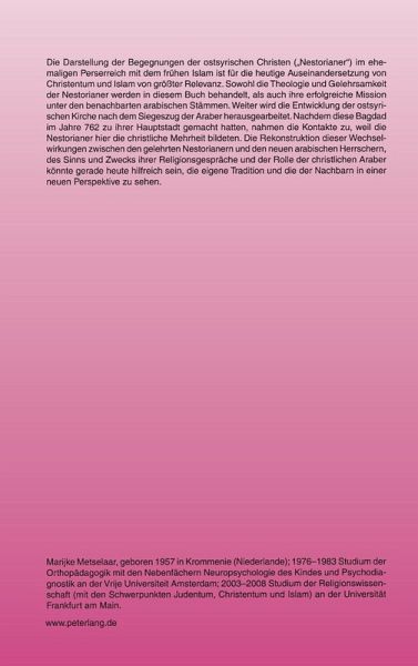 Die Darstellung der Begegnungen der ostsyrischen Christen ("Nestorianer") im ehemaligen Perserreich mit dem frühen Islam ist für die heutige Auseinandersetzung von Christentum und Islam von größter Relevanz. Sowohl die Theologie und Gelehrsamkeit der Nestorianer werden in diesem Buch behandelt, als auch ihre erfolgreiche Mission unter den benachbarten arabischen Stämmen. Weiter wird die Entwicklung der ostsyrischen Kirche nach dem Siegeszug der Araber herausgearbeitet. Nachdem diese Bagdad im Jahre 762 zu ihrer Hauptstadt gemacht hatten, nahmen die Kontakte zu, weil die Nestorianer hier die christliche Mehrheit bildeten. Die Rekonstruktion dieser Wechselwirkungen zwischen den gelehrten Nestorianern und den neuen arabischen Herrschern, des Sinns und Zwecks ihrer Religionsgespräche und der Rolle der christlichen Araber könnte gerade heute hilfreich sein, die eigene Tradition und die der Nachbarn in einer neuen Perspektive zu sehen.