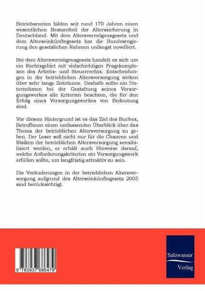 Vor diesem Hintergrund ist es das Ziel des Buches, betroffenen Unternehmen einen Überblick über das Thema der betrieblichen Altersversorgung zu geben. Der Leser soll nicht nur für die Chancen und Risiken der betrieblichen Altersversorgung sensibilisiert werden, er erhält auch Hinweise darauf, welche Anforderungskriterien ein Versorgungswerk erfüllen sollte, um langfristig attraktiv zu sein. Die Veränderungen in der betrieblichen Altersversorgung aufgrund des Alterseinkünftegesetz 2005 wurden berücksichtigt.