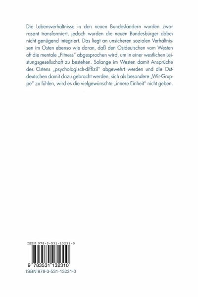 Die Lebensverhältnisse in den neuen Bundesländern wurden zwar rasant transformiert, jedoch die neuen Bundesbürger dabei nicht genügend integriert. Das liegt an unsicheren sozialen Verhältnissen im Osten ebenso wie daran, daß den Ostdeutschen seitens des Westens oft die mentale "Fitness" abgesprochen wird, um in einer westlichen Leistungsgesellschaft zu bestehen. Solange im Westen damit Ansprüche des Ostens "psychologisch-diffizil" abgewehrt werden und die Ostdeutschen damit dazu gebracht werden, sich als besondere "Wir-Gruppe" zu fühlen, wird es die vielgewünschte "innere Einheit" nicht geben.