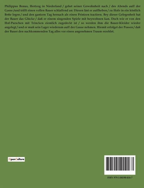 Philippus Bonus, Hertzog in Niederland / gehet seiner Gewohnheit nach / des Abends auff der Gasse /und trifft einen vollen Bauer schlaffend an: Diesen läst er auffheben / zu Hofe in ein köstlich Bette legen / und den gantzen Tag hernach als einen Printzen tractiren. Bey dieser Gelegenheit hat der Bauer das Glücke / daß er einem singenden Spiele mit heywohnen kan. Doch wie er von den Hof-Purschen mit Trincken ziemlich zugedeckt ist / so werden ihm die Bauer-Kleider wieder angelegt / und er muß sein Lager wiederum auff der Gasse nehmen. Hiemit erfolget der Possen / daß der Bauer den nachkommenden Tag alles vor einen angenehmen Traum erzehlet.