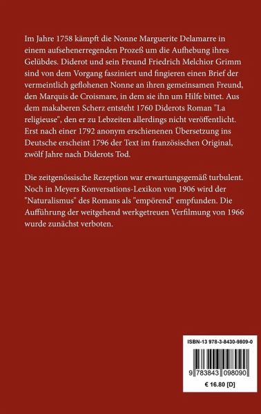 Im Jahre 1758 kämpft die Nonne Marguerite Delamarre in einem aufsehenerregenden Prozeß um die Aufhebung ihres Gelübdes. Diderot und sein Freund Friedrich Melchior Grimm sind von dem Vorgang fasziniert und fingieren einen Brief der vermeintlich geflohenen Nonne an ihren gemeinsamen Freund, den Marquis de Croismare, in dem sie ihn um Hilfe bittet. Aus dem makaberen Scherz entsteht 1760 Diderots Roman "La religieuse", den er zu Lebzeiten allerdings nicht veröffentlicht. Erst nach einer 1792 anonym erschienenen Übersetzung ins Deutsche erscheint 1796 der Text im französischen Original, zwölf Jahre nach Diderots Tod.