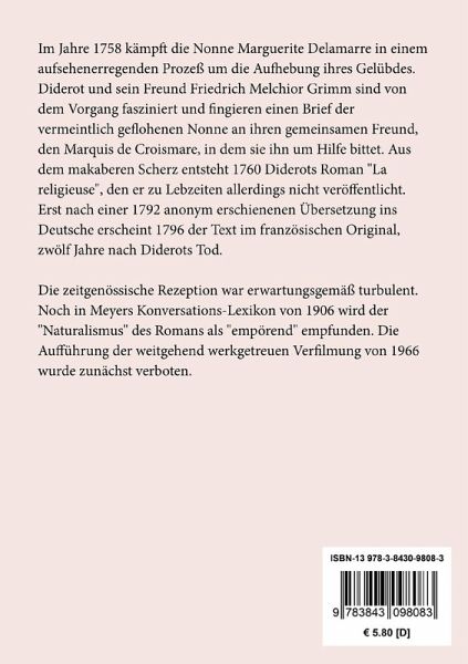 Im Jahre 1758 kämpft die Nonne Marguerite Delamarre in einem aufsehenerregenden Prozeß um die Aufhebung ihres Gelübdes. Diderot und sein Freund Friedrich Melchior Grimm sind von dem Vorgang fasziniert und fingieren einen Brief der vermeintlich geflohenen Nonne an ihren gemeinsamen Freund, den Marquis de Croismare, in dem sie ihn um Hilfe bittet. Aus dem makaberen Scherz entsteht 1760 Diderots Roman "La religieuse", den er zu Lebzeiten allerdings nicht veröffentlicht. Erst nach einer 1792 anonym erschienenen Übersetzung ins Deutsche erscheint 1796 der Text im französischen Original, zwölf Jahre nach Diderots Tod.