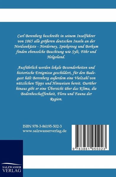 Carl Berenberg beschreibt in seinem Inselführer von 1865 alle größeren deutschen Inseln an der Nordseeküste - Norderney, Spiekeroog und Borkum finden ebensolche Beachtung wie Sylt, Föhr und Helgoland. Ausführlich werden lokale Besonderheiten und historische Ereignisse geschildert, für den Badegast hält Berenberg außerdem eine Vielzahl von nützlichen Tipps und Hinweisen bereit. Darüber hinaus gibt er eine Übersicht über das Klima, die Bodenbeschaffenheit, Flora und Fauna der Region.