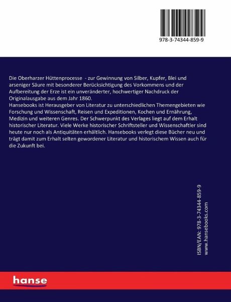 Die Oberharzer Hüttenprocesse - zur Gewinnung von Silber, Kupfer, Blei und arseniger Säure mit besonderer Berücksichtigung des Vorkommens und der Aufbereitung der Erze ist ein unveränderter, hochwertiger Nachdruck der Originalausgabe aus dem Jahr 1860.