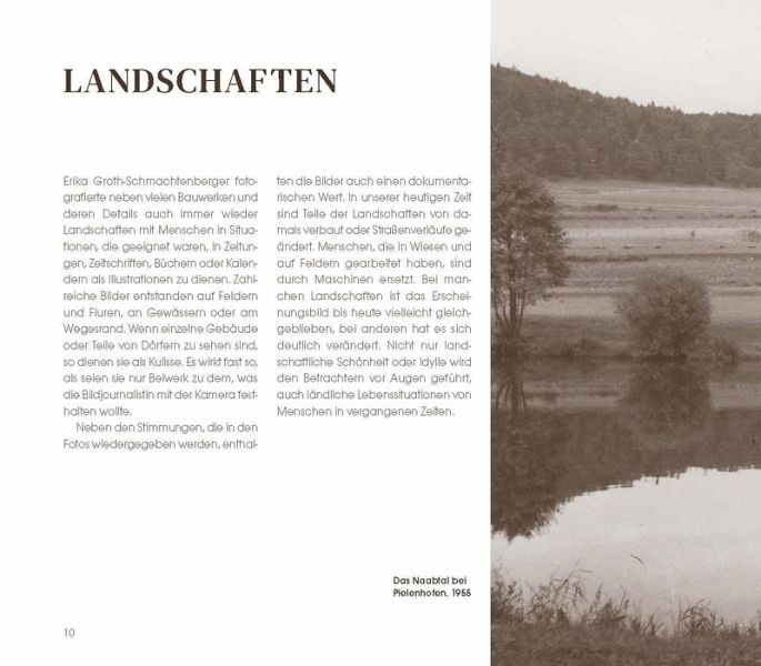 Die Bildberichterstatterin Erika Groth-Schmachtenberger (1906-1992) bereiste seit dem Beginn ihrer beruflichen Tätigkeit viele Landschaften in Deutschland und Europa, um Aufnahmen für Zeitschriften und Illustrierte zu machen. Zu diesen Reisen gehörten mehrere Aufenthalte in der Oberpfalz. Gegen Ende ihres Lebens vermachte sie ihren fotografischen Nachlass verschiedenen Museen, Archiven und Universitäten. Beinahe 2000 ihrer Bilder gingen in den Besitz des Freilandmuseums Oberpfalz über. Aus diesem Nachlass hat Ralf Heimrath eine Reihe von über 100 Bildern zusammengestellt. Mit den beigefügten Texten entführen sie den Betrachter in die Welt der Oberpfalz: mit ihren Landschaften und Ortschaften, dem Leben auf dem Land, dem Handwerk bis hin zu Festumzügen in vergangenen Jahrzehnten.