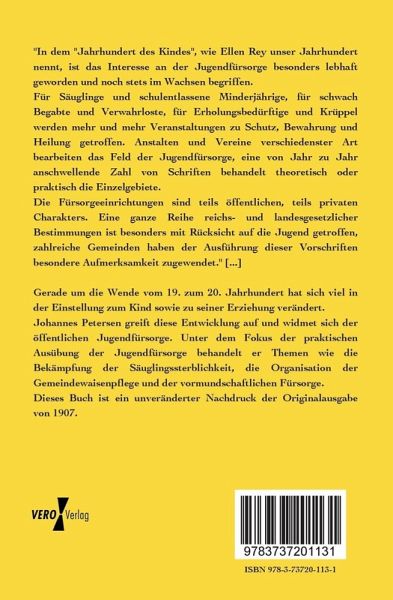 Johannes Petersen greift diese Entwicklung auf und widmet sich der öffentlichen Jugendfürsorge. Unter dem Fokus der praktischen Ausübung der Jugendfürsorge behandelt er Themen wie die Bekämpfung der Säuglingssterblichkeit, die Organisation der Gemeindewaisenpflege und der vormundschaftlichen Fürsorge.