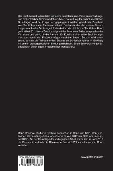 Das Buch befasst sich mit der Teilnahme des Staates als Partei an verwaltungs- und zivilrechtlichen Schiedsverfahren. Nach Darstellung der einfach-rechtlichen Grundlagen wird der Frage nachgegangen, inwiefern gerade die Zunahme von öffentlich-privaten Partnerschaften in Deutschland auch zu einem Bedeutungszuwachs der Schiedsgerichtsbarkeit im Verhältnis zur öffentlichen Hand geführt hat. Zu diesem Zweck analysiert der Autor eine Reihe entsprechender Vorhaben und prüft, ob die Parteien für Konflikte alternative Streitlösungsmechanismen in den Projektverträgen vereinbart haben. Sodann wird untersucht, ob sich die Teilnahme des Staates an Schiedsverfahren im Einklang mit seinen grundgesetzlichen Bindungen befindet. Einen Schwerpunkt der Erörterungen bilden dabei Probleme der Transparenz.