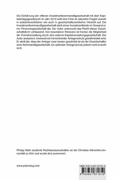 Die Einführung der offenen Investmentkommanditgesellschaft mit dem Kapitalanlagegesetzbuch im Jahr 2013 wirft eine Fülle an aktuellen Fragen sowohl in aufsichtsrechtlicher wie auch in gesellschaftsrechtlicher Hinsicht auf. Die Investmentkommanditgesellschaft stellt einen Investmentfonds im Gewand einer Personengesellschaft dar. Der Autor untersucht das Recht dieser Gesellschaftsform umfassend. Von besonderer Relevanz ist hierbei die Möglichkeit der Fremdverwaltung durch eine externe Kapitalverwaltungsgesellschaft. Der Autor analysiert, inwieweit ein hinreichender Anlegerschutz gewährleistet wird. Er stellt dar, dass der Anleger zwar besser geschützt ist als der Gesellschafter einer Kommanditgesellschaft, ein optimaler Anlegerschutz jedoch nicht erreicht wird.