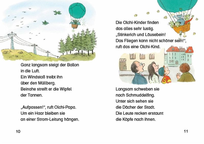 Angetrieben von Energie, die aus Olchi-Mamas Stinkerbrühe gewonnen wurde, fliegen die Olchis über Schmuddelfing. Als der Ballon sinkt, landen sie direkt auf dem Schulfest!