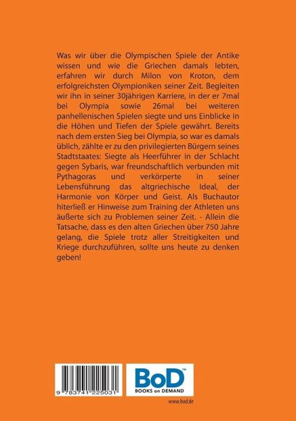 Was wir über die Olympischen Spiele der Antike wissen und wie die Griechen damals lebten, erfahren wir durch Milon von Kroton, dem erfolgreichsten Olympioniken seiner Zeit. Begleiten wir ihn in seiner 30jährigen Karriere, in der er 7mal bei Olympia sowie 26mal bei weiteren panhellenischen Spielen siegte und uns Einblicke in die Höhen und Tiefen der Spiele gewährt. Bereits nach dem ersten Sieg bei Olympia, so war es damals üblich, zählte er zu den privilegierten Bürgern seines Stadtstaates: Siegte als Heerführer in der Schlacht gegen Sybaris, war freundschaftlich verbunden mit Pythagoras und verkörperte in seiner Lebensführung das altgriechische Ideal, der Harmonie von Körper und Geist. Als Buchautor hiterließ er Hinweise zum Training der Athleten und äußerte sich zu Problemen seiner Zeit. - Allein die Tatsache, dass es den alten Griechen über 750 Jahre gelang, die Spiele trotz aller Streitigkeiten und Kriege durchzuführen, sollte uns heute zu denken geben!