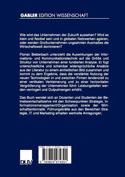 Florian Bieberbach unterzieht die Auswirkungen der Informations- und Kommunikationstechnik auf die Größe und Struktur von Unternehmen einer fundierten Analyse. Er fügt unterschiedliche und scheinbar widersprüchliche Ansätze aus der Literatur zu einem einheitlichen Bild zusammen und kommt zu dem Ergebnis, dass die verstärkte Nutzung der neuen Technologien in und zwischen Firmen tendenziell zu einer vertikalen Verkleinerung und zu einer horizontalen Vergrößerung der Unternehmen führt: Leistungstiefen werden verringert und Outputmengen erhöht.