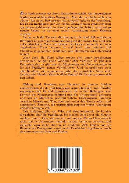 Eine Stadt erwacht aus ihrem Dornröschenschlaf. Aus langweiligem Stadtgrau wird langsam lebendiges Stadtgrün. Aber das geschieht nicht von alleine. Ein neues Bewusstsein initiiert die Wandlung. Da ist ein Buchhalter, der lange Zeit in seinem Zahlenreich gefangen ist. Eines Tages bringt ihm eine junge Frau einen Orangenbaum in seine Klausur. Langsam erwacht er zu einer neuen Ausrichtung seiner Existenz. Dieser Baum wird zu seinem Leitmotiv. Gemeinsam mit seiner Fee setzt er sich für eine Stadtbegrünung ein und gewinnt dabei zunehmend Mitbewohner für sein Anliegen. Und da sind grosse und kleine wild lebende Tiere, die in die Stadt einziehen und die Bewohner, aber auch ihresgleichen zu gegenseitiger Auseinandersetzung zwingen. Das zeigt sich u.a. an der kleinen Anna, die in einen Kater vernarrt ist und lernt, dass zwischen einem frei lebenden und einem Haustier ein Unterschied besteht. Auch die Tiere lernen mit neuen und für sie ungewohnten Situationen umzugehen. Es gibt weder Gewinner noch Verlierer, es gibt nur ein Miteinander und Nebeneinander. Tiere und Pflanzen immigrieren in grosser Zahl in unsere Agglomerationen und Zentren, ohne uns um unsere Erlaubnis zu bitten. Da finden sie geeigneten Unterschlupf und reiche Nahrungsgründe. Hat der Mensch allein Kultur? Diese Frage mag man sich neu stellen.Es ist eine witzige Fantasiegeschichte mit dem Thema Stadtfauna, die die meisten Städte mittlerweile in Hunderten von wild lebenden Tierarten beherbergen. Oft sind uns die Untermieter nicht mal bewusst.