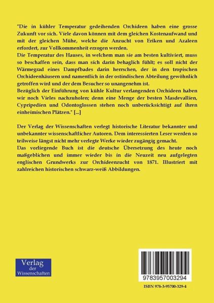 Das vorliegende Buch ist die deutsche Übersetzung des heute noch maßgeblichen und immer wieder bis in die Neuzeit neu aufgelegten englischen Grundwerks zur Orchideenzucht von 1871. Illustriert mit zahlreichen historischen schwarz-weiß Abbildungen.