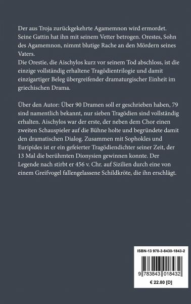 Die "Orestie" mit ihren drei Teilen "Agamemnon", "Die Grabesspenderinnen" und "Die Eumeniden" wurde im Jahre 458 v. Chr. aufgeführt. Der Text folgt der Übersetzung von Johann Gustav Droysen.