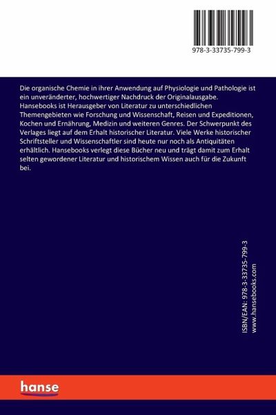 Die organische Chemie in ihrer Anwendung auf Physiologie und Pathologie ist ein unveränderter, hochwertiger Nachdruck der Originalausgabe.Hansebooks ist Herausgeber von Literatur zu unterschiedlichen Themengebieten wie Forschung und Wissenschaft, Reisen und Expeditionen, Kochen und Ernährung, Medizin und weiteren Genres. Der Schwerpunkt des Verlages liegt auf dem Erhalt historischer Literatur. Viele Werke historischer Schriftsteller und Wissenschaftler sind heute nur noch als Antiquitäten erhältlich. Hansebooks verlegt diese Bücher neu und trägt damit zum Erhalt selten gewordener Literatur und historischem Wissen auch für die Zukunft bei.