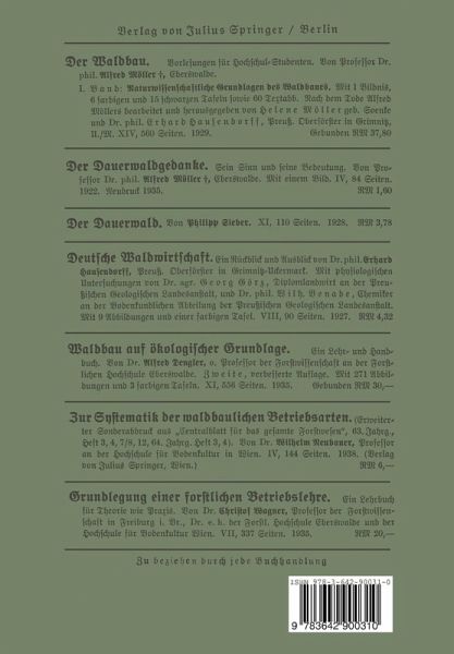 Das Wesentliche in Möllers Dauerwaldgedanken.- I. Die Drganismusidee im allgemeinen.- 1. Gefchichtlicher Werdegang.- 2. Die Drganismusidee in der modernen Biologie.- Literatur.- II. Der Dauerwaldgedanke.- 1. Die wirtfchaftliche Zielfeßung und ihre unmittelbaren Folgerungen.- 2. Der Wald als Drganismus.- 1. Die Entftehung der Borftellung vom Wald als Drganismus.- 2. Was gehört alles zum Waldwefen oder zum Waldorganismus?.- 3. Drganismus als dhnamifche Einheit.- 4. Drganismus ift mehr als Biozönofe.- 5. Der Baum als Drgan des Waldorganismus und der Wald als ewiges Lebewefen.- 1. Natürliche Lebensäußerung und kulturlicher Zweck.- 2. Anpaffung an die natürlichen, insbefondere die biologifchen Bedingungen.- 3. Waldbaulich-biologifche Folgerungen.- 4. Der Begriff Stetigkeit.- 3. Das gefunde, für unfere Zwecke nachhaltiger möglichft hoher Holzwert-erzeugung geeignete Waldwefen.- 4. Der Begriff Dauerwaldwirtfchaft.- 5. Braktifche Folgerungen und Forderungen des Dauerwaldgedankens.- 7. Der Dauerwaldgedanke als wiffenfchaftliches Broblem.- III. Dauerwaldkritik.- 1. Denglers Dauerwaldkritk.- 2. Wiedemanns Dauerwaldkritik.- 1. Die Begründung.- 2. Die Widerfprüche.- 3. Die fonftige Aufnachme des Dauerwaldgedankens.