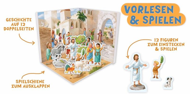 Das Kinderbuch enthält 12 Steckfiguren, sie können nach und nach passend zur Geschichte herausgenommen und zum Spielen auf der integrierten Spielschiene angeordnet und zu einer Szene zusammengestellt werden.