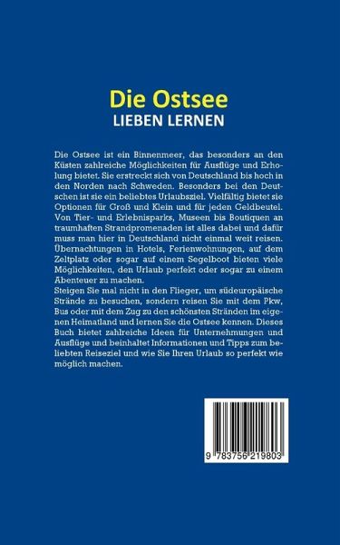 Die Ostsee ist ein Binnenmeer, das besonders an den Küsten zahlreiche Möglichkeiten für Ausflüge und Erholung bietet. Sie erstreckt sich von Deutschland bis hoch in den Norden nach Schweden. Besonders bei den Deutschen ist sie ein beliebtes Urlaubsziel. Vielfältig bietet sie Optionen für Groß und Klein und für jeden Geldbeutel. Von Tier- und Erlebnisparks, Museen bis Boutiquen an traumhaften Strandpromenaden ist alles dabei und dafür muss man hier in Deutschland nicht einmal weit reisen. Übernachtungen in Hotels, Ferienwohnungen, auf dem Zeltplatz oder sogar auf einem Segelboot bieten viele Möglichkeiten, den Urlaub perfekt oder sogar zu einem Abenteuer zu machen. Steigen Sie mal nicht in den Flieger, um südeuropäische Strände zu besuchen, sondern reisen Sie mit dem Pkw, Bus oder mit dem Zug zu den schönsten Stränden im eigenen Heimatland und lernen Sie die Ostsee kennen. Dieses Buch bietet zahlreiche Ideen für Unternehmungen und Ausflüge und beinhaltet Informationen und Tipps zum beliebten Reiseziel und wie Sie Ihren Urlaub so perfekt wie möglich machen.