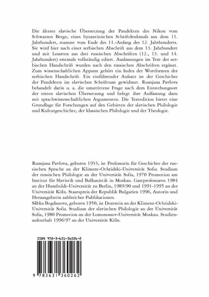 Die älteste slavische Übersetzung der Pandekten des Nikon vom Schwarzen Berge, eines byzantinischen Schriftdenkmals aus dem 11. Jahrhundert, stammt vom Ende des 11.-Anfang des 12. Jahrhunderts. Sie wird hier nach einer serbischen Abschrift aus dem 13. Jahrhundert und mit Lesarten aus drei russischen Abschriften (12., 13. und 14. Jahrhundert) erstmals vollständig ediert. Auslassungen im Text der serbischen Handschrift wurden nach den russischen Abschriften ergänzt. Zum wissenschaftlichen Apparat gehört ein Index der Wortformen der serbischen Handschrift. Ein einführender Aufsatz ist der Geschichte der Pandekten im slavischen Schrifttum gewidmet. Rumjana Pavlova behandelt darin u.a. die umstrittene Frage nach dem Entstehungsort der ersten slavischen Übersetzung und belegt ihre Auffassung dazu mit sprachwissenschaftlichen Argumenten. Die Textedition bietet eine Grundlage für Forschungen auf den Gebieten der slavischen Philologie und Kulturgeschichte, der klassischen Philologie und der Theologie.