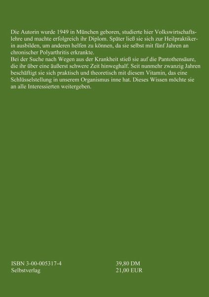 Dieses Buch bringt alles Wissenswerte über ein vergessenes Vitamin. Die Pantothensäure (Vitamin B5) hat eine Schlüsselstellung in unserem Stoffwechsel inne und kann deshalb auf vielen Gebieten für unsere Gesundheit nützlich sein: Immunsystem, Leberfunktion, Bewegungsapparat (rheumatische Beschwerden), Nervensystem, Gedächtnis und Haut. Es ist ein Antistreßvitamin, steigert die Abwehr und verhilft uns zu mehr Leistungsfähigkeit und Gesundheit. Das Buch enthält außerdem eine Auflistung und Beschreibung aller Nahrungsmittel, die dieses Vitamin enthalten. Ein detailliertes Sachverzeichnis erlaubt das schnelle Auffinden aller Krankheiten, bei denen die Pantothensäure hilfreich ist.