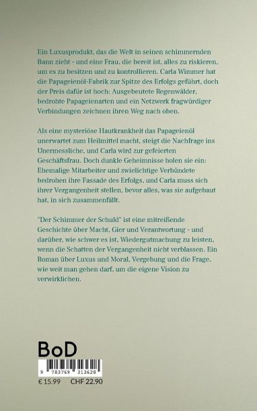 Ein Luxusprodukt, das die Welt in seinen schimmernden Bann zieht - und eine Frau, die bereit ist, alles zu riskieren, um es zu besitzen und zu kontrollieren. Carla Wimmer hat die Papageienöl-Fabrik zur Spitze des Erfolgs geführt, doch der Preis dafür ist hoch: Ausgebeutete Regenwälder, bedrohte Papageienarten und ein Netzwerk fragwürdiger Verbindungen zeichnen ihren Weg nach oben. Als eine mysteriöse Hautkrankheit das Papageienöl unerwartet zum Heilmittel macht, steigt die Nachfrage ins Unermessliche, und Carla wird zur gefeierten Geschäftsfrau. Doch dunkle Geheimnisse holen sie ein: Ehemalige Mitarbeiter und zwielichtige Verbündete bedrohen ihre Fassade des Erfolgs, und Carla muss sich ihrer Vergangenheit stellen, bevor alles, was sie aufgebaut hat, in sich zusammenfällt. "Der Schimmer der Schuld" ist eine mitreißende Geschichte über Macht, Gier und Verantwortung - und darüber, wie schwer es ist, Wiedergutmachung zu leisten, wenn die Schatten der Vergangenheit nicht verblassen. Ein Roman über Luxus und Moral, Vergebung und die Frage, wie weit man gehen darf, um die eigene Vision zu verwirklichen.