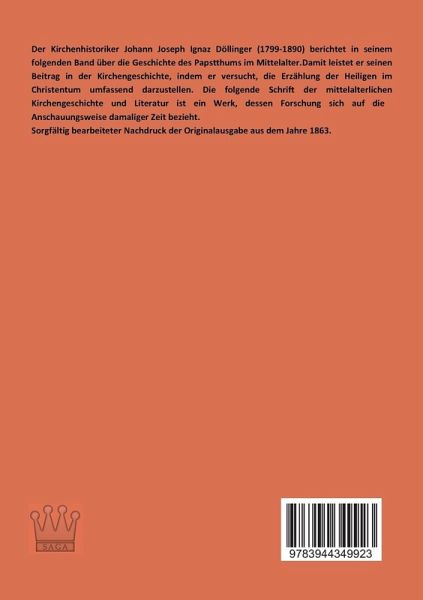 Der Kirchenhistoriker Johann Joseph Ignaz Döllinger (1799-1890) berichtet in seinem folgenden Band über die Geschichte des Papstthums im Mittelalter.Damit leistet er seinen Beitrag in der Kirchengeschichte, indem er versucht, die Erzählung der Heiligen im Christentum umfassend darzustellen. Die folgende Schrift der mittelalterlichen Kirchengeschichte und Literatur ist ein Werk, dessen Forschung sich auf die Anschauungsweise damaliger Zeit bezieht.