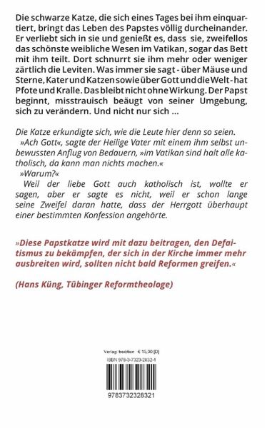 Die schwarze Katze, die sich eines Tages bei ihm einquartiert, bringt das Leben des Papstes völlig durcheinander. Er verliebt sich in sie und genießt es, dass sie, zweifellos das schönste weibliche Wesen im Vatikan, sogar das Bett mit ihm teilt. Dort schnurrt sie ihm mehr oder weniger zärtlich die Leviten. Was immer sie sagt - über Mäuse und Sterne, Kater und Katzen sowie über Gott und die Welt - hat Pfote und Kralle. Das bleibt nicht ohne Wirkung. Der Papst beginnt, misstrauisch beäugt von seiner Umgebung, sich zu verändern. Und nicht nur sich ...
