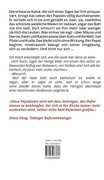 Die schwarze Katze, die sich eines Tages bei ihm einquartiert, bringt das Leben des Papstes völlig durcheinander. Er verliebt sich in sie und genießt es, dass sie, zweifellos das schönste weibliche Wesen im Vatikan, sogar das Bett mit ihm teilt. Dort schnurrt sie ihm mehr oder weniger zärtlich die Leviten. Was immer sie sagt - über Mäuse und Sterne, Kater und Katzen sowie über Gott und die Welt - hat Pfote und Kralle. Das bleibt nicht ohne Wirkung. Der Papst beginnt, misstrauisch beäugt von seiner Umgebung, sich zu verändern. Und nicht nur sich ...