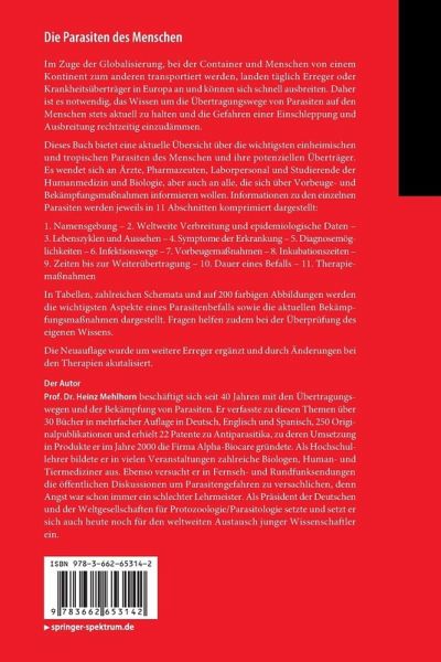 Dieses Buch bietet eine aktuelle Übersicht über die wichtigsten einheimischen und tropischen Parasiten des Menschen und ihre potenziellen Überträger. Es wendet sich an Ärzte, Pharmazeuten, Laborpersonal und Studierende der Humanmedizin und Biologie, aber auch an alle, die sich über Vorbeuge- und Bekämpfungsmaßnahmen informieren wollen. Informationen zu den einzelnen Parasiten werden jeweils in 11 Abschnitten komprimiert dargestellt: