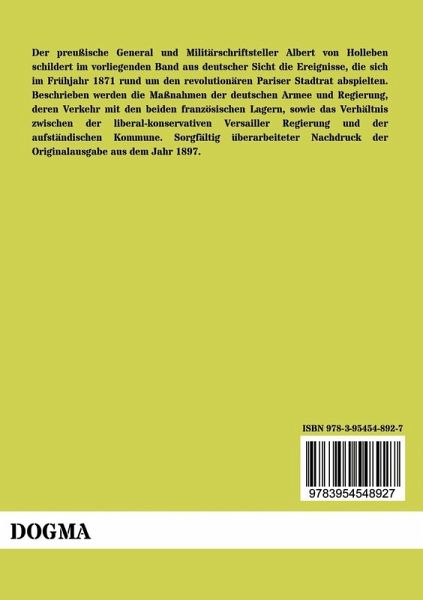 Der preußische General und Militärschriftsteller Albert von Holleben schildert im vorliegenden Band aus deutscher Sicht die Ereignisse, die sich im Frühjahr 1871 rund um den revolutionären Pariser Stadtrat abspielten. Beschrieben werden die Maßnahmen der deutschen Armee und Regierung, deren Verkehr mit den beiden französischen Lagern, sowie das Verhältnis zwischen der liberal-konservativen Versailler Regierung und der aufständischen Kommune. Sorgfältig überarbeiteter Nachdruck der Originalausgabe aus dem Jahr 1897.