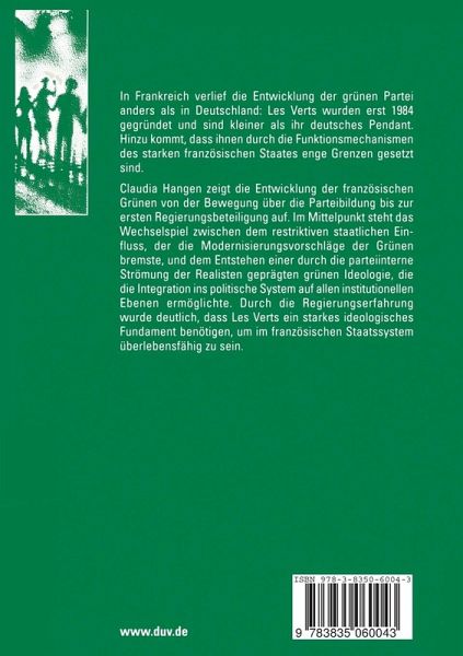 Claudia Hangen zeigt die Entwicklung der französischen Grünen von der Bewegung über die Parteibildung bis zur ersten Regierungsbeteiligung auf. Im Mittelpunkt steht das Wechselspiel zwischen dem restriktiven staatlichen Einfluss, der die Modernisierungsvorschläge der Grünen bremste, und dem Entstehen einer durch die parteiinterne Strömung der Realisten geprägten grünen Ideologie, die die Integration ins politische System auf allen institutionellen Ebenen ermöglichte. Durch die Regierungserfahrung wurde deutlich, dass Les Verts ein starkes ideologisches Fundament benötigen, um im französischen Staatssystem überlebensfähig zu sein.