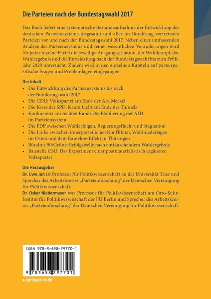 Das Buch liefert eine systematische Bestandsaufnahme der Entwicklung des deutschen Parteiensystems insgesamt und aller im Bundestag vertretenen Parteien vor und nach der Bundestagswahl 2017. Neben einer umfassenden Analyse des Parteiensystems und seiner wesentlichen Veränderungen wird für jede einzelne Partei die jeweilige Ausgangssituation, der Wahlkampf, das Wahlergebnis und die Entwicklung nach der Bundestagswahl bis zum Frühjahr 2020 untersucht. Zudem wird in den einzelnen Kapiteln auf parteispezifische Fragen und Problemlagen eingegangen.