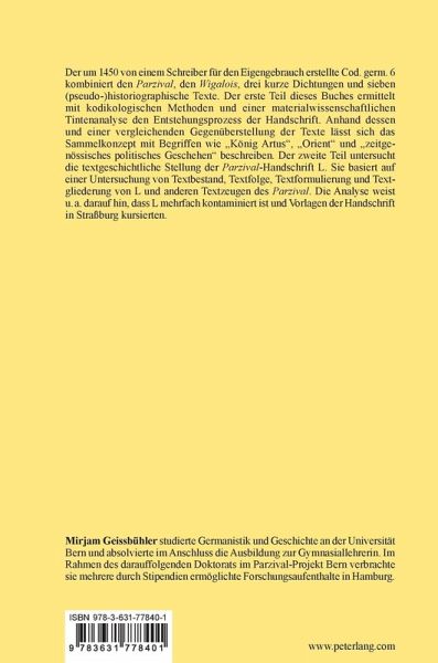 Der um 1450 von einem Schreiber für den Eigengebrauch erstellte Cod. germ. 6 kombiniert den Parzival, den Wigalois, drei kurze Dichtungen und sieben (pseudo-)historiographische Texte. Der erste Teil dieses Buches ermittelt mit kodikologischen Methoden und einer materialwissenschaftlichen Tintenanalyse den Entstehungsprozess der Handschrift. Anhand dessen und einer vergleichenden Gegenüberstellung der Texte lässt sich das Sammelkonzept mit Begriffen wie «König Artus», «Orient» und «zeitgenössisches politisches Geschehen» beschreiben. Der zweite Teil untersucht die textgeschichtliche Stellung der Parzival-Handschrift L. Sie basiert auf einer Untersuchung von Textbestand, Textfolge, Textformulierung und Text-gliederung von L und anderen Textzeugen des Parzival. Die Analyse weist u. a. darauf hin, dass L mehrfach kontaminiert ist und Vorlagen der Handschrift in Straßburg kursierten.