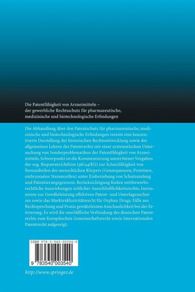Die Abhandlung über den Patentschutz für pharmazeutische, medizinische und biotechnologische Erfindungen vereint eine konzentrierte Darstellung der historischen Rechtsentwicklung sowie der allgemeinen Lehren des Patentrechts mit einer systematischen Untersuchung von Sonderproblematiken der Patentfähigkeit von Arzneimitteln. Schwerpunkt ist die Kommentierung umstrittener Vorgaben der sog. Biopatentrichtlinie (98/44/EG) zur Schutzfähigkeit von Bestandteilen des menschlichen Körpers (Gensequenzen, Proteinen, embryonalen Stammzellen) unter Einbeziehung von Schutzumfang und Patentierungsgrenzen. Berücksichtigung finden wettbewerbsrechtliche Auswirkungen zeitlicher Ausschließlichkeitsrechte, Instrumente zur Gewährleistung effektiven Patent- und Unterlagenschutzes sowie das Marktexklusivitätsrecht für Orphan Drugs. Fälle aus Rechtsprechung und Praxis gewährleisten Anschaulichkeit bei der Erörterung. Es wird die unerläßliche Verbindung des deutschen Patentrechts zum Europäischen Gemeinschaftsrecht sowie Internationalen Patentrecht aufgezeigt.