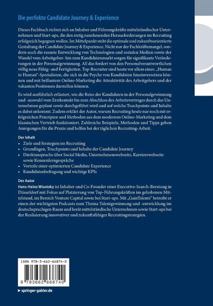 Es wird ausführlich erläutert, wie die Reise der Kandidaten in der Personalgewinnung und -auswahl vom Erstkontakt bis zum Abschluss des Arbeitsvertrages durch das Unternehmen geplant sowie durchgeführt wird und auf welche Touchpoints und Inhalte es dabei ankommt. Zudem erklärt der Autor, warum Recruiting heute nur noch mit erfolgreichen Prinzipien und Methoden aus dem modernen Online-Marketing und dem klassischen Vertrieb funktioniert. Zahlreiche Beispiele, Methoden und Tipps geben Anregungen für die Praxis und helfen bei der täglichen Recruiting-Arbeit.