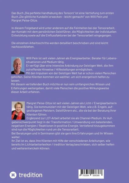 In diesem Folgeband, aufbauend auf das Buch "Die göttliche Kundalalini erwecken - leicht gemacht", wird unter anderem auf die Feinheiten bei der Tensorarbeit, die Einflussfaktoren sowie auch auf die unterschiedlichen Dimensionen eingegangen.Des Weiteren spielt der Kontakt mit dem persönlichen Geistführer, der Geistigen Welt, die Möglichkeiten der individuellen Entwicklung und die verschiedenen Arten von Karma eine Rolle.Die Anleitungen unterstützen außerdem den Körper, den Geist und die Seele wieder in Balance und Harmonie zu bringen.Das Buch wendet sich an spirituell interessierte Leser/-innen sowie Anwender/-innen, die Freude haben sich weiter zu entwickeln und zu spüren, wie wundervoll die Anleitungen wirken.