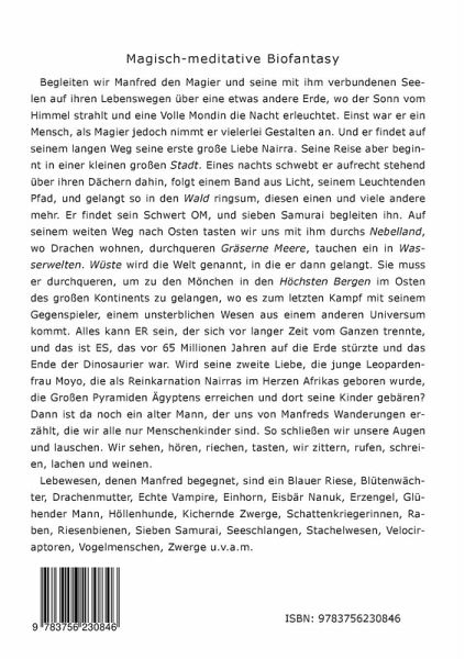 Begleiten wir unsere Helden auf ihren Reisen durch Raum und Zeit. Alles aber beginnt im Hier und Heute in einer kleinen Großstadt im Westen Eurasiens. Manfred, der eines Nachts magische Kräfte erhält und sich ganz ohne Zauberstab und -sprüche in Tiere und Pflanzen verwandeln kann, kämpft sich nicht nur allein, sondern auch mit Hilfe der bekanntesten Schwertkämpfer Japans bis nach Tibet durch. Auch in Afrika, Amerika und Australien hält er sich auf, der einsam und allein auf der Suche nach seiner großen Liebe ist. Nairra ist ihr Name. Und er besucht die junge Massai Moyo, die nach Norden zu den Pyramiden unterwegs ist. Und dann ist da noch Drefman, ER, der Schwarze, männlicher Teil von ES, Manfreds Gegenspieler aus einem anderen Universum, der allmächtig scheint und tut, was er will. Wer von beiden wird am Ende, das kein Ende ist, im Kampf siegen? Wer wird überleben?Biofantasy, Spannende Fantasy der besonderen Art, in der der Held zahlreichen Wesen aus Natur und Mythologie begegnet und sich in einige von ihnen verwandelt. Nicht verwunderlich, wo doch der Autor Zoologe und Fantasyfan ist und sich für Mythologie interessiert. Kurzum: Fantastische Fantasy, zoologisch fundiert, meditativ und religiös.LeserInnen-Meinungen zum Leuchtenden Pfad des Magiers: »Obgleich in Prosa gehalten, empfinde ich dieses Werk als eine einzige Poesie, ein Poem. In seinem sprachlichen Duktus liegt sein Zauber.« Leser aus Kaiserslautern. »Dieser Wald wird wie durch einen Nebelschleier unscharf, es ist ein Traumland, ein bunter Mix aus religiösen Mythen, skurrilen und grotesken Szenen und meditativen Selbstbetrachtungen.« alien contact. » (...) bin fasziniert von dieser magischen Vielfalt von Phantasie. (...) Hier ist nichts unmöglich auf dieser ungewöhnlichen Reise in eine ungewöhnliche Dimension ... Wie außen so innen, oder der alte Mystikerspruch, wie oben so unten, alles ist Eines. Ein wahrhaft faszinierendes Buch, um der Gegenwart zu entfliehen bzw. sie in Frage zu stellen.« Peter Würl.