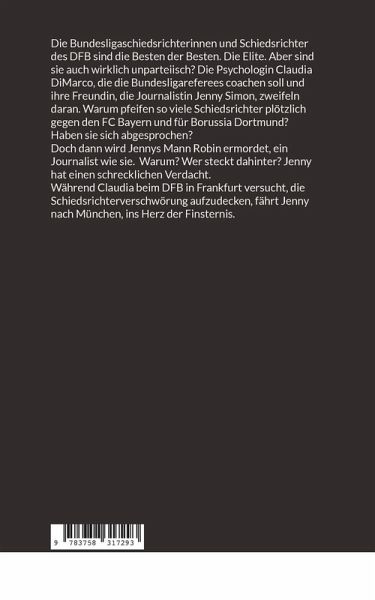 Die Bundesligaschiedsrichterinnen und Schiedsrichter des DFB sind die Besten der Besten. Die Elite. Aber sind sie auch wirklich unparteiisch? Die Psychologin Claudia DiMarco, die die Bundesligareferees coachen soll und ihre Freundin, die Journalistin Jenny Simon, zweifeln daran. Warum pfeifen so viele Schiedsrichter plötzlich gegen den FC Bayern und für Borussia Dortmund? Haben sie sich abgesprochen? Doch dann wird Jennys Mann Robin ermordet, vom Wannseemörder, einem aserbaidschanischen Auftragskiller. Warum? Wer steckt dahinter? Jenny hat einen schrecklichen Verdacht. Während Claudia beim DFB in Frankfurt versucht, die Schiedsrichterverschwörung aufzudecken, fährt Jenny nach München, ins Herz der Finsternis.