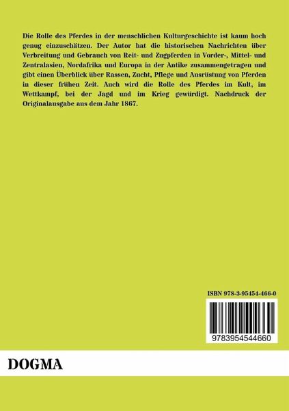 Die Rolle des Pferdes in der menschlichen Kulturgeschichte ist kaum hoch genug einzuschätzen. Der Autor hat die historischen Nachrichten über Verbreitung und Gebrauch von Reit- und Zugpferden in Vorder-, Mittel- und Zentralasien, Nordafrika und Europa in der Antike zusammengetragen und gibt einen Überblick über Rassen, Zucht, Pflege und Ausrüstung von Pferden in dieser frühen Zeit. Auch wird die Rolle des Pferdes im Kult, im Wettkampf, bei der Jagd und im Krieg gewürdigt. Nachdruck der Originalausgabe aus dem Jahr 1867.