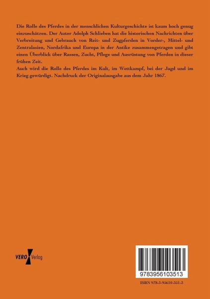 Die Rolle des Pferdes in der menschlichen Kulturgeschichte ist kaum hoch genug einzuschätzen. Der Autor Adolph Schlieben hat die historischen Nachrichten über Verbreitung und Gebrauch von Reit- und Zugpferden in Vorder-, Mittel- und Zentralasien, Nordafrika und Europa in der Antike zusammengetragen und gibt einen Überblick über Rassen, Zucht, Pflege und Ausrüstung von Pferden in dieser frühen Zeit.
