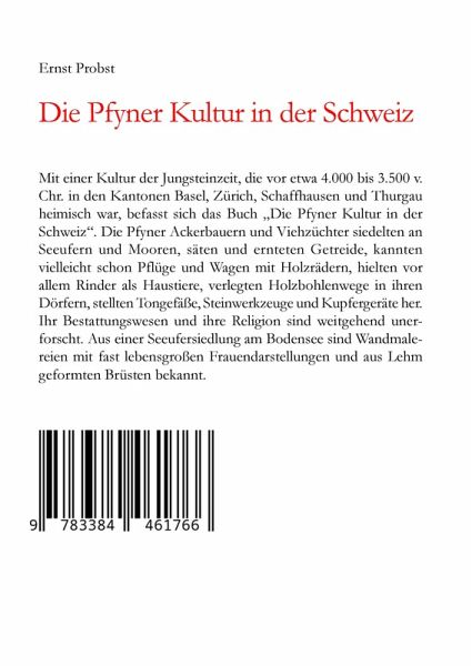 VorwortMit einer Kultur der Jungsteinzeit, die vor etwa 4.000 bis 3.500 v. Chr. in den Kantonen Basel, Zürich, Schaffhausen und Thurgau heimisch war, befasst sich das Buch "Die Pfyner Kultur in der Schweiz". Die Pfyner Ackerbauern und Viehzüchter siedelten an Seeufern und Mooren, säten und ernteten Getreide, kannten vielleicht schon Pflüge und Wagen mit Holzrädern, hielten vor allem Rinder als Haustiere, verlegten Holzbohlenwege in ihren Dörfern, stellten Tongefäße, Steinwerkzeuge und Kupfergeräte her. Ihr Bestattungswesen und ihre Religion sind weitgehend unerforscht. Aus einer Seeufersiedlung am Bodensee sind Wandmalereien mit fast lebensgroßen Frauendarstellungen und aus Lehm geformten Brüsten bekannt.