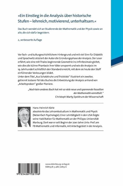 "Noch kein anderes Buch hat mir so viele neue und spannende Fassetten der Mathematik vermittelt." (Christoph Marty, Spektrum der Wissenschaft März 2011) "Dieses wundervolle Buch Körles ist weder eine Geschichte der Analysis, noch ein Analysis-Lehrbuch und schon gar keine Anekdotensammlung. Es ist ein im besten Sinne transdisziplinäres Buch, das man nicht nur den Studierenden der Mathematik empfehlen sollte, sondern allen, die mehr über die Wurzeln der Analysis wissen wollen." (Thomas Sonar, Mathematische Semesterberichte 57/1, 2010) "Hans-Heinrich Körle schafft es wirklich mit wenig Worten viel zu sagen und das gilt nicht nur dort wo die "Formelsprache" verwendet wird, sondern auch da wo mit Worten erklärt wird oder wo die geschichtlichen Hintergründe, dargestellt werden.[...] Sei es durch die Erläuterungen wie das Gebilde der Analysis entstanden ist (eine Fundgrube für die Unterichtsvorbereitung), sei es durch die Beweise im zweiten Teil. Schüler und Schülerinnen, die überlegen Mathematik zu studieren, erhalten hier einen ersten Einblick in das, was sie im Studium erwartet, und manches aus diesem Buch wird man auch im Unterricht, z.B. als Vorlage für Schülerreferate verwenden können." (V. Pfueller, lehrerbibliothek.de)
