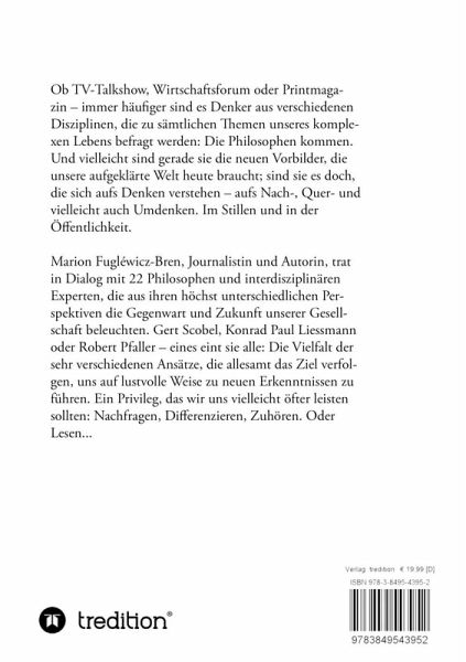 Ob TV-Talkshow, Wirtschaftsforum oder Printmagazin immer häufiger sind es Denker aus verschiedenen Disziplinen, die zu sämtlichen Themen unseres komplexen Lebens befragt werden: Die Philosophen kommen. Und vielleicht sind gerade sie die neuen Vorbilder, die unsere aufgeklärte Welt heute braucht; sind sie es doch, die sich aufs Denken verstehen aufs Nach-, Quer- und vielleicht auch Umdenken. Im Stillen und in der Öffentlichkeit.Marion Fugléwicz-Bren, Journalistin und Autorin, trat in Dialog mit 22 Philosophen und interdisziplinären Experten, die aus ihren höchst unterschiedlichen Perspektiven die Gegenwart und Zukunft unserer Gesellschaft beleuchten. Gert Scobel, Konrad Paul Liessmann oder Robert Pfaller eines eint sie alle: Die Vielfalt der sehr verschiedenen Ansätze, die allesamt das Ziel verfolgen, uns auf lustvolle Weise zu neuen Erkenntnissen zu führen. Ein Privileg, das wir uns vielleicht öfter leisten sollten: Nachfragen, Differenzieren, Zuhören. Oder Lesen...